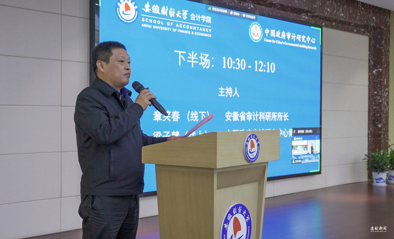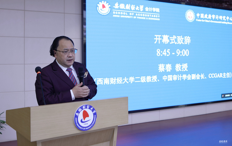 蔡春代表中国政府审计研究中心致辞。他表示,安徽财经大学会计审计学科领域位于全国前列,培养了一大批会计审计领域教学和科研人才。中国政府审计研究中心推出走进全国高校行动计划目的在于整合学科领域的优质资源,并把资源效益外溢到所有需要推进会计审计学科发展的学校,同时提升会计审计学科的影响力,为中国经济高质量发展贡献智慧与力量。