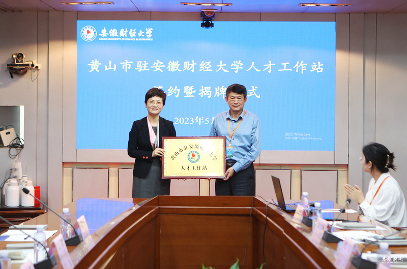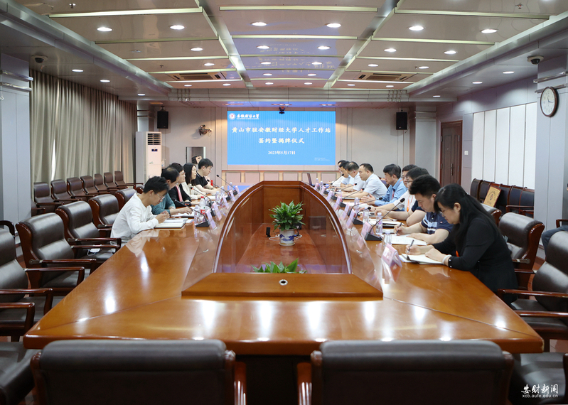 5月17日上午,黄山市驻安徽财经大学人才工作站签约暨揭牌仪式在龙湖东校区一号行政楼视频会议室举行。校党委副书记杨烨,黄山市人力资源和社会保障局党组书记、局长程燕,黄山城投集团有限公司党委副书记汪蓉,黄山人才发展服务局局长姚剑平出席签约仪式。学校相关职能部门负责人参加签约仪式。