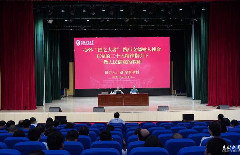 6月14日下午,学校在龙湖东校区艺术楼报告厅举办“新时代师德师风建设”专题报告会。党的二十大代表、全国模范教师、全国优秀共产党员、安徽师范大学马克思主义学院路丙辉教授应邀作专题报告。校党委书记虞宝桃出席报告会并于会前与路丙辉教授进行了亲切交谈。学校近八百名教职工参加报告会。校党委常委、副校长储德银主持报告会。