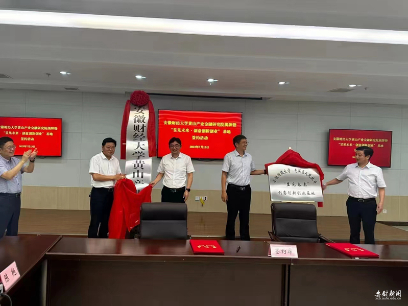 近日,安徽财经大学黄山产业金融研究院揭牌暨“昱见未来”创意创新创业基地签约仪式在黄山市屯溪区举行。副校长张焕明出席签约仪式。黄山市地方金融监督管理局局长陶瑞,屯溪区区委书记吴旭光,区委副书记、区长杨林等市区领导和驻黄有关单位负责人,我校社会合作处、金融学院负责人和校友代表参加了签约仪式。