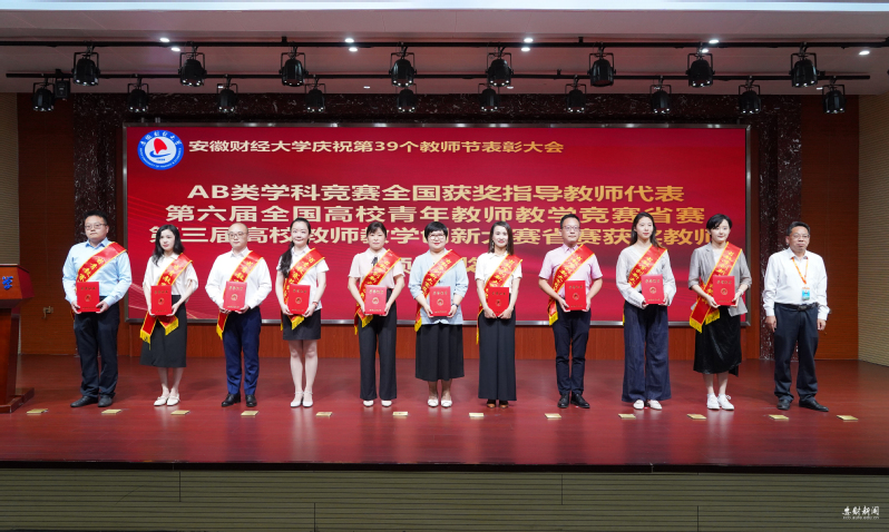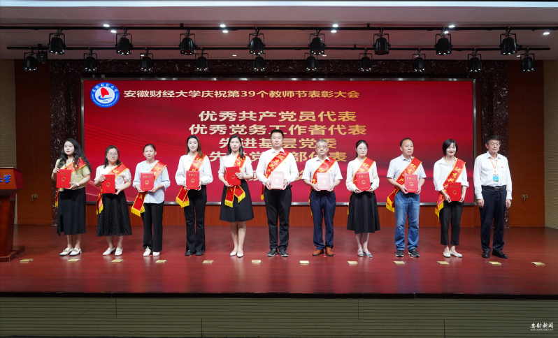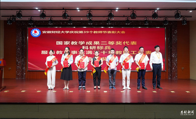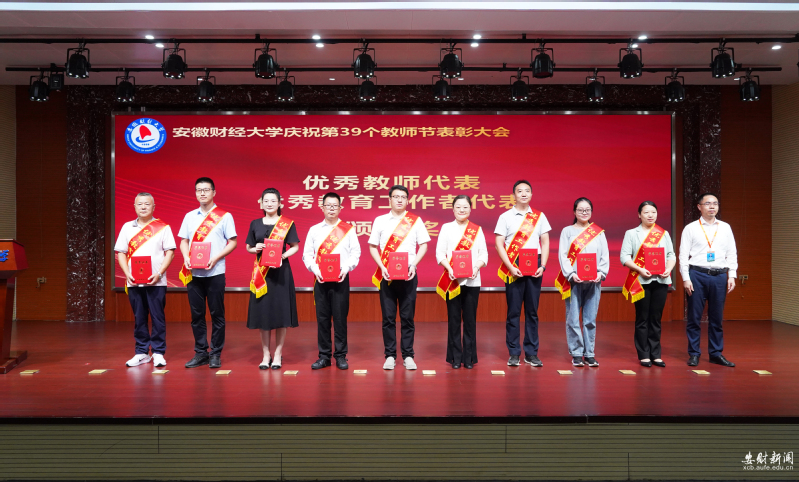 大会对国家教学成果奖获奖代表、“兴教-谋英”科研标兵、服务教育事业满三十年教职工、学科竞赛全国获奖指导教师、全国高校青年教师教学竞赛省赛获奖教师、高校教师教学创新大赛省赛获奖教师、优秀共产党员、优秀党务工作者、先进基层党委和先进党支部、优秀教师、优秀教育工作者等代表进行了表彰。优秀教师代表王姝文、优秀共产党员代表王丽叶分享了在教书育人、管理服务岗位上担当作为、爱岗敬业的经历和体会,表示将不忘立德树人初心,牢记为党育人、为国育才使命,启智润心、培根铸魂,为培养担当民族复兴大任的时代新人而接续奋斗。学生代表、马克思主义学院22级研究生蒋泽华感恩学校培养,表示将带着安财精神勇毅前行,为实现中华民族伟大复兴贡献青春力量。