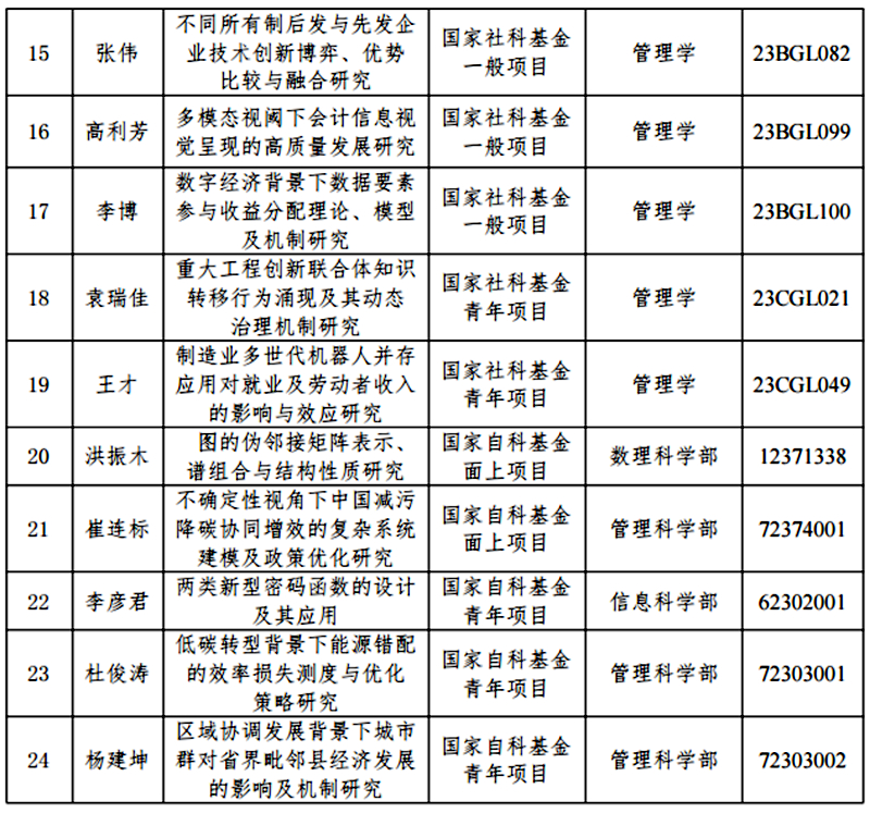 国家社科基金获批项目学科领域覆盖应用经济学、理论经济学、管理学、统计学、国际问题研究、法学、人口学、中国历史、体育学9个学科,其中,应用经济学、理论经济学、管理学等经管类学科立项13项,位居全国高校第4位,充分彰显了学校经管学科的特色优势和整体实力。国家自科基金获批项目实现立项类别结构优化,项目涵盖学部数量有所提升,包括数理科学部、信息科学部和管理科学部3个学部。
