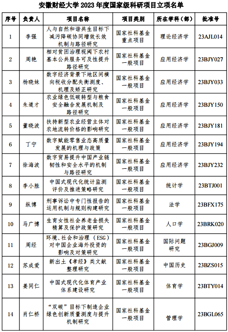 近日,全国哲学社会科学工作办公室和国家自然科学基金委员会公布了2023年度科研项目评审结果,我校共获批24项国家级科研项目,其中国家社科基金年度项目19项(含重点项目1项)、国家自科基金项目5项。我校2023年度国家社科基金年度项目立项数创历史新高,较2022年增长73%,立项数位居全国财经类高校第9位、安徽省高校第3位。