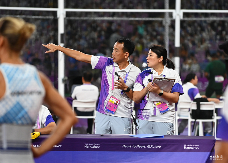张苏老师与国际技术官员在场地组织投掷项目比赛(右一)