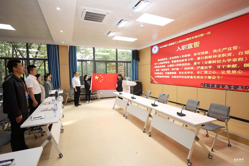 仪式上,新入职教职工面对国旗进行庄严宣誓。新入职教职工代表金融学院周强作表态发言,表示要立志成为“有理想信念、有道德情操、有扎实学识、有仁爱之心”的好老师,不辜负学校的殷切期望。仪式结束后,全体教师参观了校史馆和“建设特色高水平大学 服务安徽高质量发展”成果展厅。