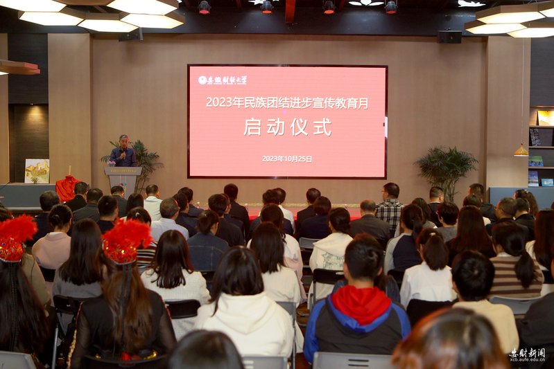 宋马林在致辞中指出,启动安徽财经大学2023年民族团结进步宣传教育月是学校党委贯彻落实党中央关于铸牢中华民族共同体意识决策部署的重要举措之一。他表示,学校党委坚持党对民族工作的全面领导,认真贯彻落实中央及省委民族工作会议精神,聚焦铸牢中华民族共同体意识的工作主线,坚持把民族团结进步宣传教育融入思政教育、知识传授、社会实践等各环节,教育引导师生牢固树立休戚与共、荣辱与共、生死与共、命运与共的共同体理念,不断增进师生对伟大祖国、中华民族、中华文化、中国共产党、中国特色社会主义的认同。他要求广大师生进一步增强对民族团结进步宣传教育重要意义的认识,从爱家庭、爱学校做起,传递民族团结进步的温暖真情,播撒民族团结进步的红色种子,唱响民族团结进步的时代旋律,书写民族团结进步的华彩篇章,以更加昂扬的精神状态和驰而不息的奋斗姿态,把爱祖国作为自己毕生的价值追求,为推进铸牢中华民族共同体意识、实现“民族团结一家亲”贡献自己的力量。
