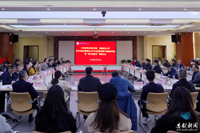 虞宝桃介绍了学校办学历史、办学特色和办学成效。他指出,数字创意产业作为安徽省十大新兴产业之一,与学校众多学科专业关联度高、融合性强、合作空间广,是建设文化强省、坚定文化自信的重要举措。学校将牢牢把握高质量发展首要任务,服务数字创意学科专业优势特色,主动优化学科布局,积极推动学科交叉、产学研融合和学科群建设,全力打造学科专业交叉研究平台,持续探索解决实际问题的对策方案,在服务国家和地方经济社会发展中贡献安财力量。