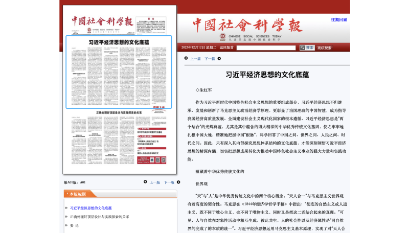 12月12日,《中国社会科学报》头版头条刊登我校党委副书记、校长朱红军教授的理论文章《习近平经济思想的文化底蕴》。