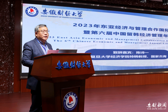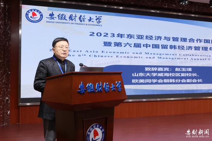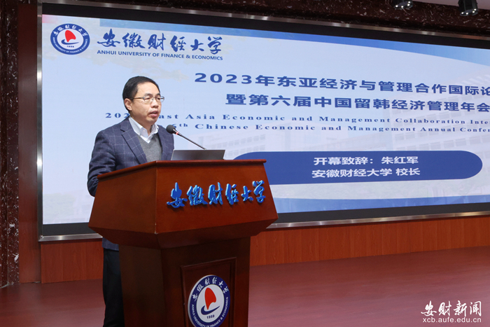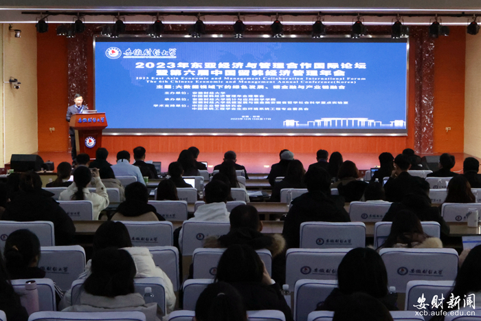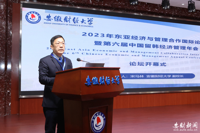 12月15日至17日,由中国留韩经济管理年会理事会、安徽财经大学共同主办,统数学院、低碳发展与碳金融安徽省哲学社会科学重点实验室联合承办的2023年东亚经济与管理合作国际论坛暨第六届中国留韩经济管理年会在龙湖东校区求真楼一楼报告厅举行。复旦大学经济学院陈诗一教授,中国企业管理研究会会长、中国社会科学院工业经济研究所黄速建教授,校党委副书记、校长朱红军教授,校党委常委、副校长宋马林教授,Research Policy主编、韩国首尔国立大学李根教授,山东大学威海校区副校长、欧美同学会朝韩分会副会长赵玉璞教授,大韩贸易投资振兴公社中国地区总代表洪彰杓先生,韩国仁荷大学全球治理学院院长崔龙录教授,韩国经济学会副会长、忠南国立大学经营经济研究院院长吴根烨教授,北京师范大学环境学院副院长张力小教授,China & World Economy常务主编冯晓明教授,浙江理工大学经济管理学院副院长廖中举教授,中韩(盐城)产业园程明主任,中韩(烟台)产业园孙安华主任出席会议。来自国内外高校、中韩产业园区及新闻媒体的300余名嘉宾参加会议。宋马林主持开幕式。
