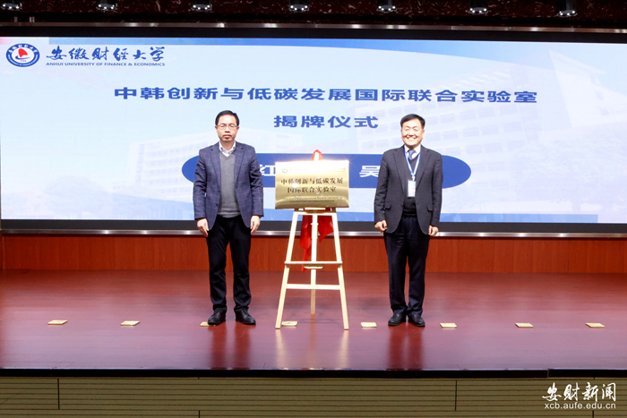 宋马林与吴根烨就成立的“中韩创新与低碳发展国际联合实验室”代表双方签订合作协议,朱红军与吴根烨共同为实验室揭牌。
