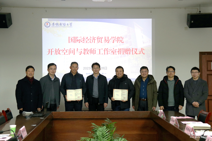 12月28日下午,国贸学院在龙湖东校区2号行政楼301会议室举行开放空间与教师工作室捐赠仪式。校党委副书记张亚新出席仪式。上海安益资产管理有限公司合伙人、总裁、1981级商业经济专业校友杜龙泉,宁波钟意饰品有限公司董事长、2000级国际经济与贸易专业校友罗丰云,社会合作处、财务处、国贸学院相关负责人参加仪式。捐赠仪式由国贸学院党委书记胡尊亮主持。