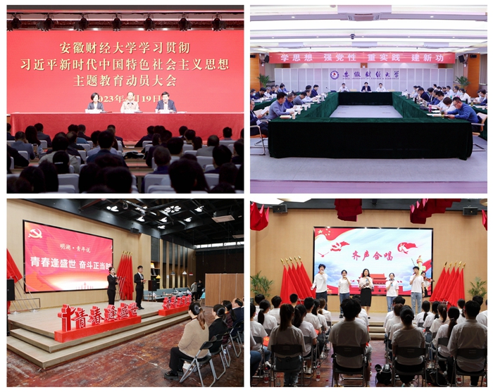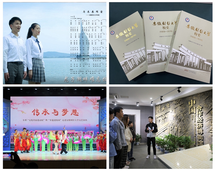 学校坚持以文化人、以文育人,坚持社会主义先进文化的前进方向,深化爱国主义、集体主义、社会主义教育,推动理想信念教育常态化制度化,大力培育和践行社会主义核心价值观,着力赓续中华文脉、推动中华优秀传统文化创造性转化和创新性发展。深入挖掘和提炼安财文化内涵和核心价值,把安财精神、校训精神与“四史”教育、传承弘扬中华优秀传统文化有机结合,编辑出版学校校史、校友访谈回忆录,发布校歌《与未来同窗》,建成并充分发挥校史馆、中国合作经济博物馆、VR党建馆和廉政教育馆等场馆的育人功能,持续抓好校情校史教育、诚信教育、廉洁文化教育。深入开展“我最喜爱的好老师”“我们身边的好青年”等评选活动,发挥师生先进典型示范引领作用,持续营造校风优、教风良、学风好的教育生态。推进“五育并举”人才培养体系建设,加强体育美育劳动教育,弘扬劳动精神、奋斗精神、奉献精神、创造精神和节约意识。组织开展“高雅艺术进校园”“明湖·青年说”“体育文化节”等特色文体活动,丰富师生精神生活。深入开展文明校园创建活动,学校被评为第一届安徽省文明校园。进一步美化教学楼、图书馆、实验室、体育馆、学生食堂和学生公寓等场所,发布学校视觉形象识别系统(VIS),把“安财蓝”融入“中国红”,汇聚推进学校事业发展的强大合力。