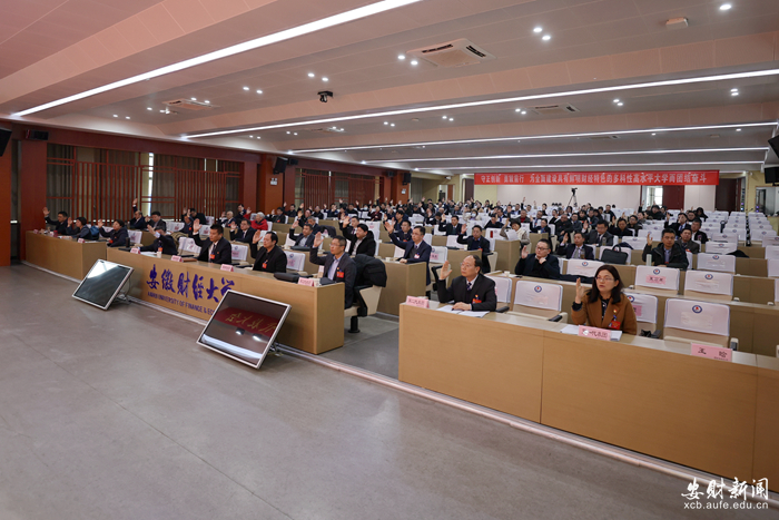 1月14日上午,中国共产党安徽财经大学第七次党员代表大会第二次全体会议在龙湖东校区求真楼一楼报告厅举行。省委教育工委组干处派专人到会指导。校党委书记虞宝桃,党委副书记、校长朱红军,党委副书记张亚新,党委常委、纪委书记、监察专员武刚,党委常委、副校长宋马林、储德银、赵晓明、王兵出席会议。虞宝桃主持会议。