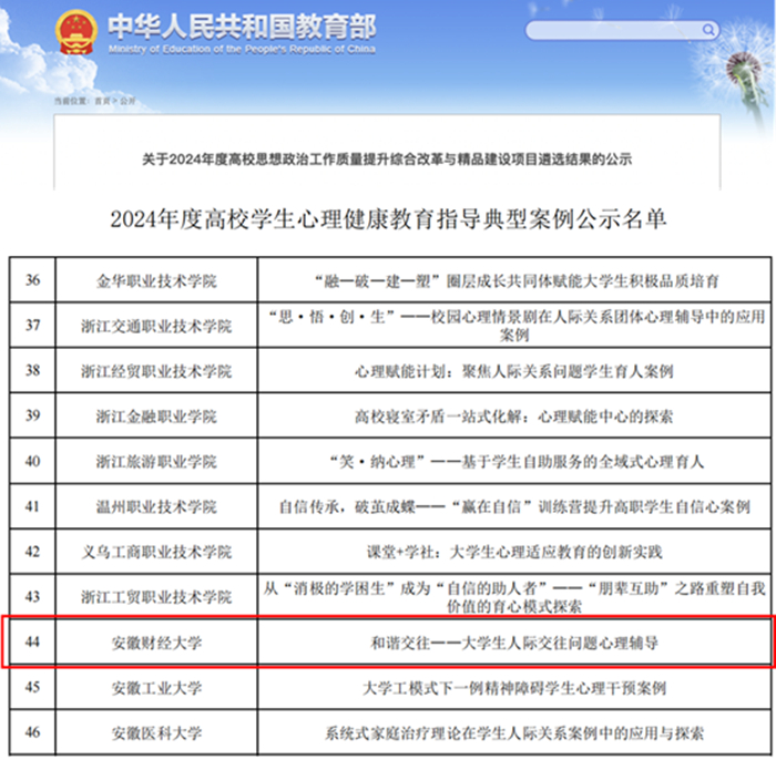 近日,在教育部思想政治工作司开展的2024年度高校思想政治工作质量提升综合改革与精品建设项目遴选中,我校学生处大学生心理健康教育中心组织申报的《和谐交往——大学生人际交往问题心理辅导》成功入选2024年度高校学生心理健康教育指导典型案例,是安徽省本次获评该案例的3所高校之一。