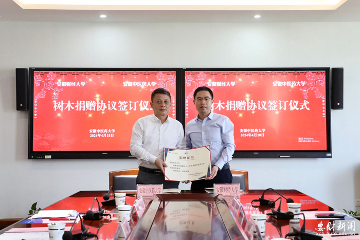 4月18日,我校向安徽中医药大学捐赠树木仪式在安徽中医药大学少荃湖校区举行。我校党委副书记、校长朱红军,校党委常委、纪委书记、监察专员武刚,安徽中医药大学党委副书记、校长许钒,党委常委、副校长魏骅,两校有关部门负责人参加捐赠仪式。捐赠仪式由魏骅主持。