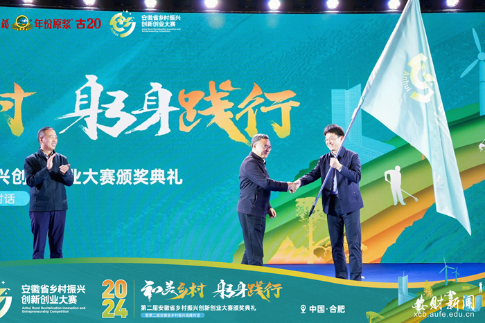 典礼最后举行了交接仪式,张亚新代表学校接过大赛赛旗,第三届安徽省乡村振兴创新创业大赛将在安徽财经大学举办。