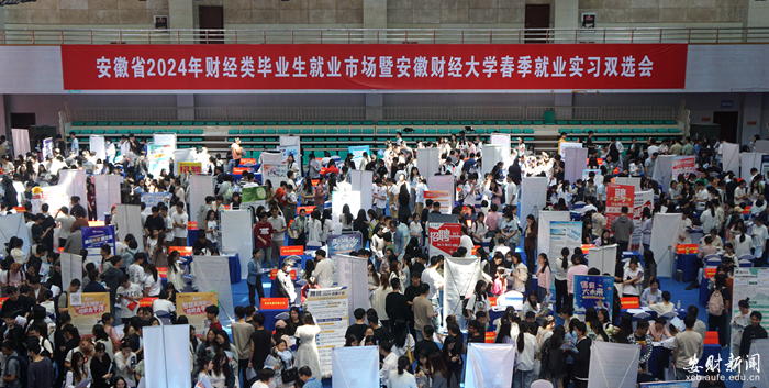 5月8日上午,由安徽省教育厅主办、安徽财经大学和安徽省大中专毕业生就业指导中心承办的安徽省2024年财经类毕业生就业市场暨安徽财经大学春季就业实习双选会在龙湖东校区体育馆举行。校党委常委、副校长储德银深入活动现场指导工作。中国十五冶金建设集团有限公司、浙江交工集团股份有限公司、信永中和会计师事务所、马鞍山学院、淮北市建投控股集团有限公司、池州市投资控股集团有限公司等150余家用人单位齐聚我校招贤纳才,提供岗位3200余个,吸引了近2000名毕业生入场求职。