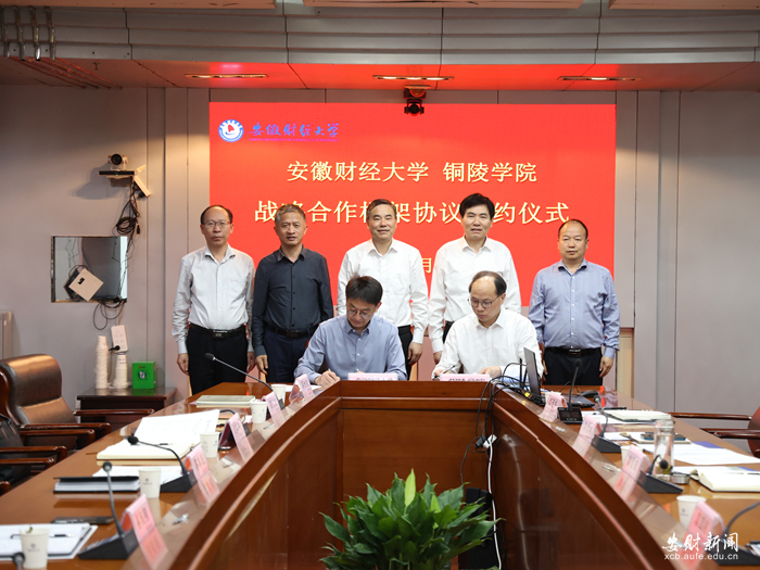 5月15日上午,我校与铜陵学院战略合作框架协议签约仪式在龙湖东校区一号办公楼视频会议室举行。铜陵学院党委书记吴照明,党委副书记、校长苏本跃,党委委员、副校长夏美武、疏仁华,我校党委书记虞宝桃,党委副书记张亚新,党委常委、副校长储德银,出席并见证签约仪式。张亚新和夏美武分别代表双方签署战略合作框架协议。我校及铜陵学院相关部门负责人参加座谈会。虞宝桃主持签约仪式。