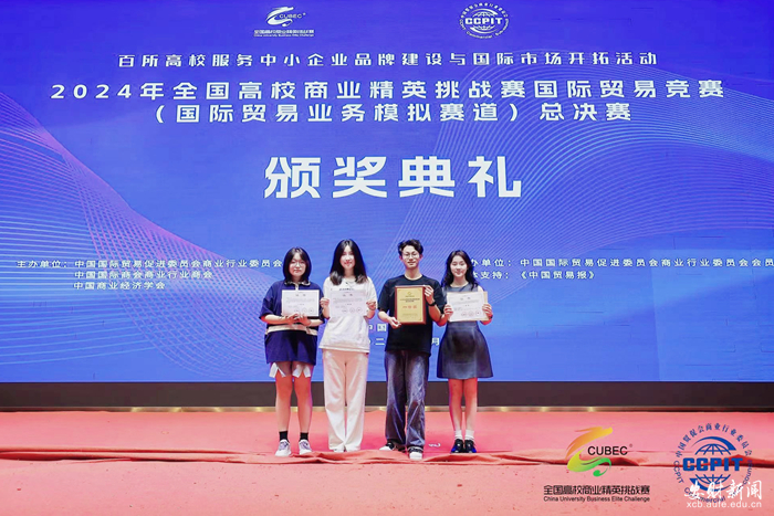 5月27日,2024年全国高校商业精英挑战赛国际贸易竞赛总决赛在浙江宁波落幕。由国际经济贸易学院徐磊老师指导的团队(团队成员:陈阳、陈灿、周硕、谢沛霖、白凌漪、李合欢、刘羽彤、胡泽钜)在全国总决赛中斩获一等奖,这也是国贸学院师生连续两年获得该赛事一等奖。