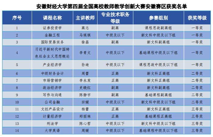 近日,第四届全国高校教师教学创新大赛安徽赛区获奖名单公布,我校共获得一等奖5项、二等奖5项、三等奖4项,获奖奖项及数目均位于安徽省高校前列。其中,金融学院高志教师团队、马瑛琪教师团队和国际经济贸易学院徐磊老师将代表安徽省角逐第四届全国高校教师教学创新大赛。