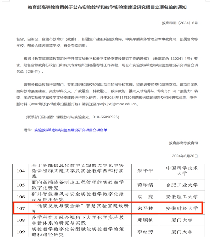近日,教育部高等教育司公布了实验教学和教学实验室建设研究项目立项名单,我校宋马林教授团队申报的《“低碳发展与碳金融”智慧实验室建设研究》项目成功立项。此次安徽省高校共获批立项8项,其中省属高校3项,展现了我校持续推进实验教学改革的成果。