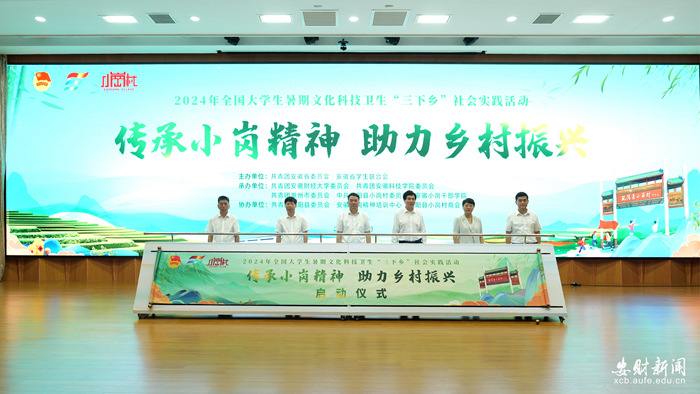 7月16日上午,由共青团安徽省委、安徽省学生联合会主办,我校团委牵头,联合安徽科技学院团委、滁州团市委、小岗村党委以及安徽小岗干部学院共同承办的2024年全国大学生暑期“三下乡”社会实践“传承小岗精神 助力乡村振兴”专项活动在凤阳县小岗村正式启动。共青团安徽省委书记陈明生,安徽财经大学党委书记虞宝桃,安徽科技学院党委书记时伟,滁州市委副书记金力,滁州市委常委、凤阳县委书记朱林等领导出席启动仪式。启动仪式由团省委副书记窦贤琨主持。