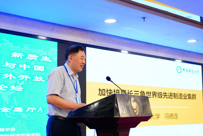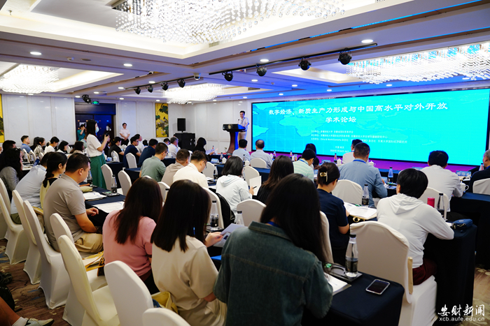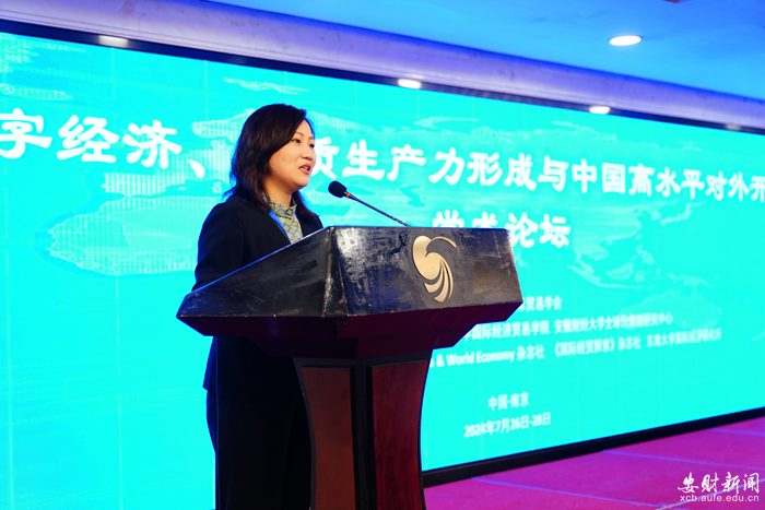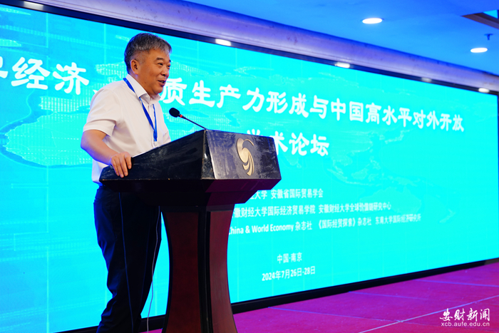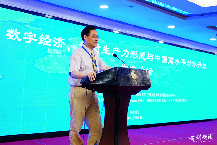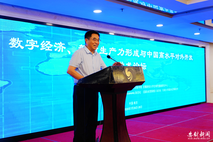 7月26日至28日,安徽财经大学与安徽省国际贸易学会共同主办的“数字经济、新质生产力形成与中国高水平对外开放”学术论坛在南京市成功举办。江苏省社科联党组书记、常务副主席张新科,辽宁大学党委副书记、校长余淼杰(线上),南京师范大学党委副书记、校长华桂宏,安徽财经大学党委常委、副校长赵晓明,安徽省国际贸易学会会长冯德连,复旦大学经济学院院长张军出席论坛。东南大学社科处、China & World Economy杂志社、我校国际经济贸易学院相关负责人,全国30余所高等院校的90余位专家学者参加论坛。论坛开幕式由东南大学国际经济研究所所长邱斌教授主持。