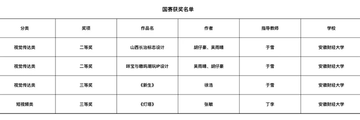 近日,2024年第18届中国好创意暨全国数字艺术设计大赛落下帷幕,国赛获奖名单揭晓。在于雪、丁李老师的指导下,我校艺术学院吴雨晴、胡仔豪两位同学在视觉传达类赛项揽获二等奖2项,徐浩同学在视觉传达类赛项获三等奖,张敏同学在短视频类赛项获三等奖。
