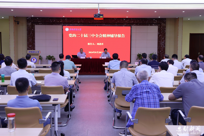 8月28日上午,学校在龙湖东校区求真楼二楼报告厅举行党的二十届三中全会精神宣讲报告会。中华全国供销合作总社原秘书长兼办公厅主任、中国合作经济学会副会长刘进喜应邀来我校作宣讲报告。校党委书记虞宝桃主持报告会。校党委副书记、校长朱红军,校党委副书记张亚新,校党委常委、纪委书记、监察专员武刚,校党委常委、副校长储德银、赵晓明、王兵出席报告会。校党委理论学习中心组成员、中层正职管理干部、分管科研工作副院长参加报告会。