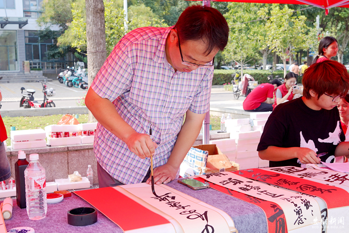 “这么新奇,原来我们学院专业学的内容这么高大上!”在管工学院报到处,管工学院学科竞赛展区——智能车、无人机特色展台吸引了众多家长和新生驻足观看,让新生们在第一时间感受到了科技的魅力。统数学院用558个印有新生名字的可乐堆砌成塔,瓶身上镌刻着对新同学美好的祝福。金融学院开展“时光明信片”迎新活动,通过给未来的自己写信鼓励新同学们坚守初心、逐梦前行。艺术学院老师现场挥毫泼墨,“不负韶华”“壮志凌云”......共同书写新学期的美好篇章。经济学院、国贸学院、工管学院、会计学院、财公学院设置创意满满的签名墙和打卡点,让新同学们可以在这里留下自己的足迹,记录下这个特别的时刻,把迎新氛围感拉满。文学院、法学院、马克思主义学院设立党员先锋岗,组建党员志愿者队伍,为新生及家长提供咨询、引路、答疑等贴心服务,用实际行动展现党员的责任与担当。